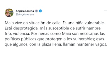 Ángela Lerena, reconocida periodista deportiva, utilizó la red social del pajarito para dar su opinión al respecto. “Maia vive en situación de calle. Es una niña vulnerable. Está desprotegida, más susceptible de sufrir hambre, frío, violencia. Por nenas como Maia son necesarias las políticas públicas que protegen a los vulnerables; esas que algunos, con la plaza llena, llaman mantener vagos”, señaló.