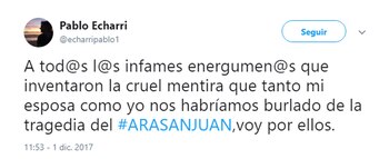 Horas antes había usado su cuenta de Twitter para referirse al tema: "A todos los infames energúmenos que inventaron la cruel mentira, que tanto mi esposa como yo nos habríamos burlado de la tragedia del ARA San Juan, voy por ellos".