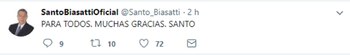 Minutos después de su última aparición en el noticiero de El Trece, Biasatti utilizó su cuenta personal de Twitter para escribir el mismo mensaje que dijo en su despedida del noticiero: "para todos, muchas gracias".