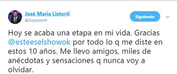 "Hoy se acaba una etapa en mi vida. Gracias @esteeselshowok por todo lo q me diste en estos 10 años. Me llevo amigos, miles de anécdotas y sensaciones q nunca voy a olvidar", expresó a través de su cuenta de Twitter José María Listorti, el histórico conductor del ciclo, quien inmediatamente recibió el apoyo y la felicitación de amigos y colegas como Guido Záffora, Federico Hoppe, Marcela Coronel, Pedro Alfonso, Mariano Iúdica, Jey Mammon, Lourdes Sánchez y hasta Marcelo Tinelli, entre otros.