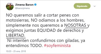 "Más que una posición, tengo una vida vivida", advirtió Jimena Barón. "Y sé por las cosas que pasamos las mujeres, por las cosas que luchamos, sé que las cosas siguen desparejas. No podría no ser feminista", concluyó. Y no es una idea sacada de contexto, porque lo tiene, justamente: es en respuesta a un tuit de hace unos días, donde avisaba que no quería "salir a cortar penes con motosierras".