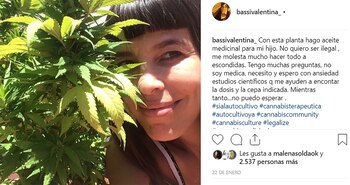 La actriz Valentina Bassi (46) contó en Instagram que cultiva cannabis y produce aceite medicinal para dárselo a su hijo, Lisandro (10), fruto de su relación con Ulises Rosell."Con esta planta hago aceite medicinal para mi hijo. No quiero ser ilegal, me molesta mucho hacer todo a escondidas. Tengo muchas preguntas, no soy médica, necesito y espero con ansiedad estudios científicos que me ayuden a encontrar la dosis y la cepa indicada. ¿Mientras tanto? no puedo esperar", dijo en la red social.