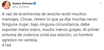 Antes de la gala, Giménez había escrito una reflexión en su cuenta de Twitter: "A raíz de la entrevista de anoche recibí muchos mensajes. Chicas, reitero lo que ya dije muchas veces: Ninguna mujer, bajo ninguna circunstancia, debe soportar malos tratos, mucho menos golpes. Al primer síntoma de violencia cortá esa relación, un hombre agresivo no cambia. #144″.