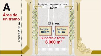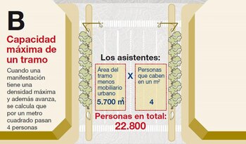 Es el método clásico. Para realizar una medición por metros cuadrados, en primer lugar, se debe delimitar sobre un plano la superficie ocupada por los manifestantes; la distancia desde la cabecera hasta el final de la aglutinación de gente. Solo se considera el área utilizable. Es decir, se deben descartar los árboles, los autos y otros elementos arquitectónicos.