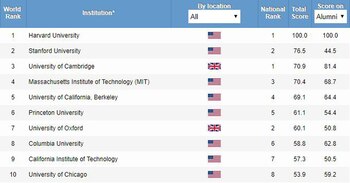 Los primeros diez puestos se los reparten universidades estadounidenses y británicas. A Harvard le sigue Stanford, Cambridge, Massachusetts, Berkeley, Princeton, Oxford, Columbia, el Instituto Tecnológico de California y la Universidad de Chicago. Recién en el escalafón 19 se rompe la tendencia con la aparición del Instituto Federal de Tecnología de Zúrich, Suiza.
