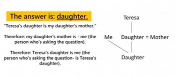 Sin embargo, la respuesta correcta es la 3: su hija. Además de la solución, brindaron una explicación. La clave está en la relación con Teresa. En primer lugar, se puede cambiar el enunciado por "la hija de mi madre soy yo". Luego, como la hija de Teresa soy yo, y soy la que lo pregunta, entonces yo soy su hija.