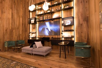 Almohadones, algunos amarillos, salpican cómodos sillones azules -un color que se vio mucho en ferias de diseño por el mundo, especialmente en Milán- y grises que se reparten en un amplio ambiente que antes funcionaba como capilla. La iluminación es amable, y la calidez la proporciona la madera en las paredes. Una pantalla de 100 pulgadas reina sobre una plataforma, también de madera, en la que destaca una biblioteca multifunción. El mobiliario es tan flexible como los usos de este espacio.