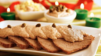 -Para la salsa, pasar por cedazo de alambre 100gr de atún y seis filetes de anchoas. Poner en un recipiente hondo dos yemas, batirlas mientras se le va agregando aceite, poquito a poco, hasta que esté bien espesa; agregarle entonces el atún y anchoas, pimienta, una tacita de vinagre, una cucharadita de mostaza y mezclar formando una salsa liviana, agregándole para ello, si fuera necesario, más vinagre.