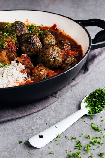 En una sartén con un poco de aceite sellar las albóndigas para que estén doraditas de todos lados y luego agregarlas a la olla con la salsa, llevando a hervor bajo durante 30 minutos.