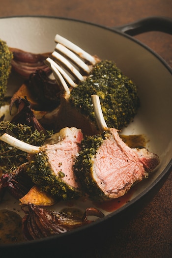 Cortar cada carré por la mitad sirviendo 4 huesos con su carne a cada persona. Para acompañar se pueden hacer cebollas moradas caramelizadas o con papas o batatas al horno.