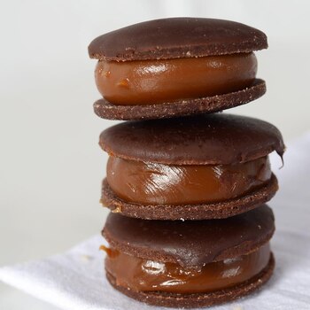 - Dejar enfriar y con una manga le ponemos dulce de leche a una tapita y cerramos con otra. Lo colocamos en una reja y los bañamos con el chocolate cobertura (previamente derretido a baño María junto a la manteca). Dejar enfriar el chocolate y listo.
