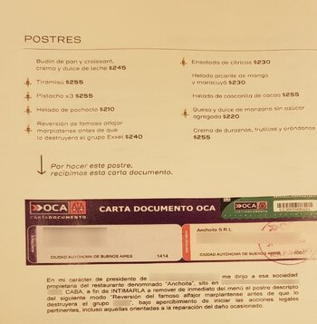 Y allí está, plasmada en el menú del restaurante que reciben los comensales que se acercan a comer al local, la carta documento que habría sido enviada por The Exxel Group S.A a Anchoita S.R.L.
