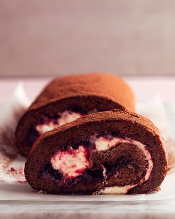 Sacar el papel manteca, untar con el dulce de cereza negra. Volver a enrollar y espolvorear con cacao.