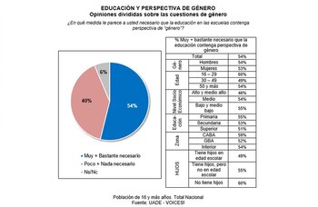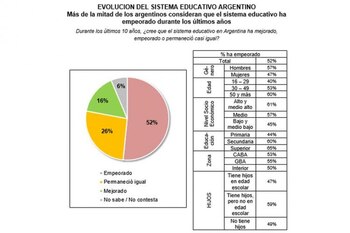 Más de la mitad de los argentinos (52%) consideran que el sistema educativo ha empeorado durante los últimos 10 años, percepción más alta entre los hombres, los ciudadanos de mayor edad, mayor nivel socioeconómico y mayor nivel educativo. En términos comparados, hay una tendencia negativa en la percepción sobre la evolución del sistema respecto del año 2016. Luego de 4 años, el reconocimiento de una mejoría del sistema disminuyó en 8 puntos porcentuales (24% en 2016 vs. 16% en 2020), mientras que las opiniones en torno a que el mismo ha empeorado subieron 10 puntos porcentuales (42% en 2016 vs. 52% en 2020).