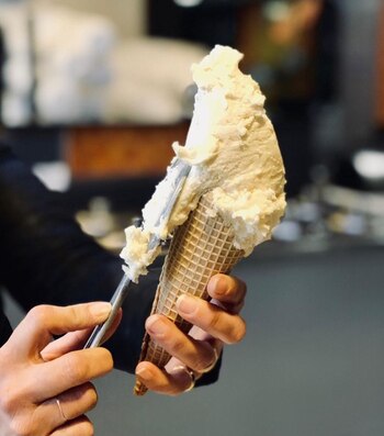 Los gustos que más salen son: chocolate vegano, espresso martini, oreo latte, turmeric latte y queso atuel. Esta semana tienen 50% de descuento en 1/4 de Kg y su modalidad es que tienen mesas en el Interior, en la vereda y también cuentan con patio.