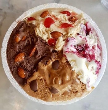 Los 5 gustos que más salen son: super sambayón, chocolate con almendras, mango maracuyá, dulce de leche bombón y chocolate marroc. Actualmente están trabajando con modalidad de delivery y take away. Y para la semana tienen promo en 3 x 2 en cuartos y medios kilos