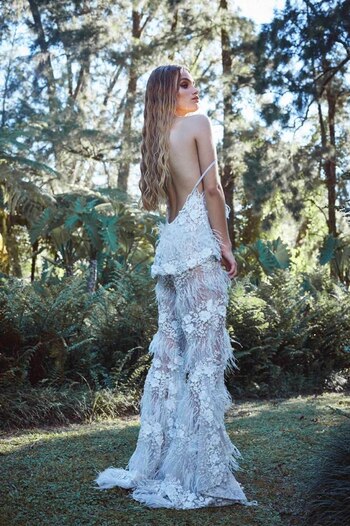 “El Paraíso Perdido” es una una colección muy femenina con mangas abullonadas , lo último en tendencia en las colecciones europeas donde Saiach jugó con volúmenes y géneros como el guipure, broderie, tules, organza de seda con bordados a mano tanto en richelieu como en volumen formando hojas, flores y búlgaros.