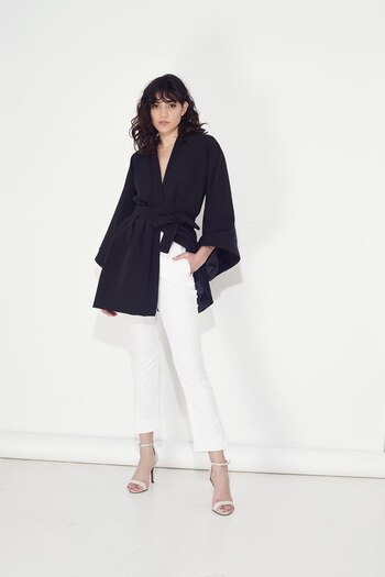 El kimono tiene la practicidad de no esconder ninguna estructura, algo que es lo más importante de la colección, ya que en los demás trajes son protagonistas las hombreras, los botones, las pinzas.