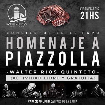 El primer Concierto en el Faro, el viernes 3 de diciembre, estará a cargo del maestro Walter Ríos y su Quinteto que realizará un Homenaje a Piazzolla a cien años del nacimiento del gran maestro de la música argentina.