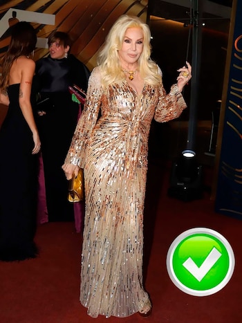 “La conductora y actriz lució espectacular con un vestido muy simple de paillettes dorados que es tendencia esta temporada. El diseño es muy simple, pero muy sentador, muy acorde para la ocasión. Maquillaje y un peinado increíbles”, opinó Profumo. “Correctisima, impecable como siempre”, agregó.