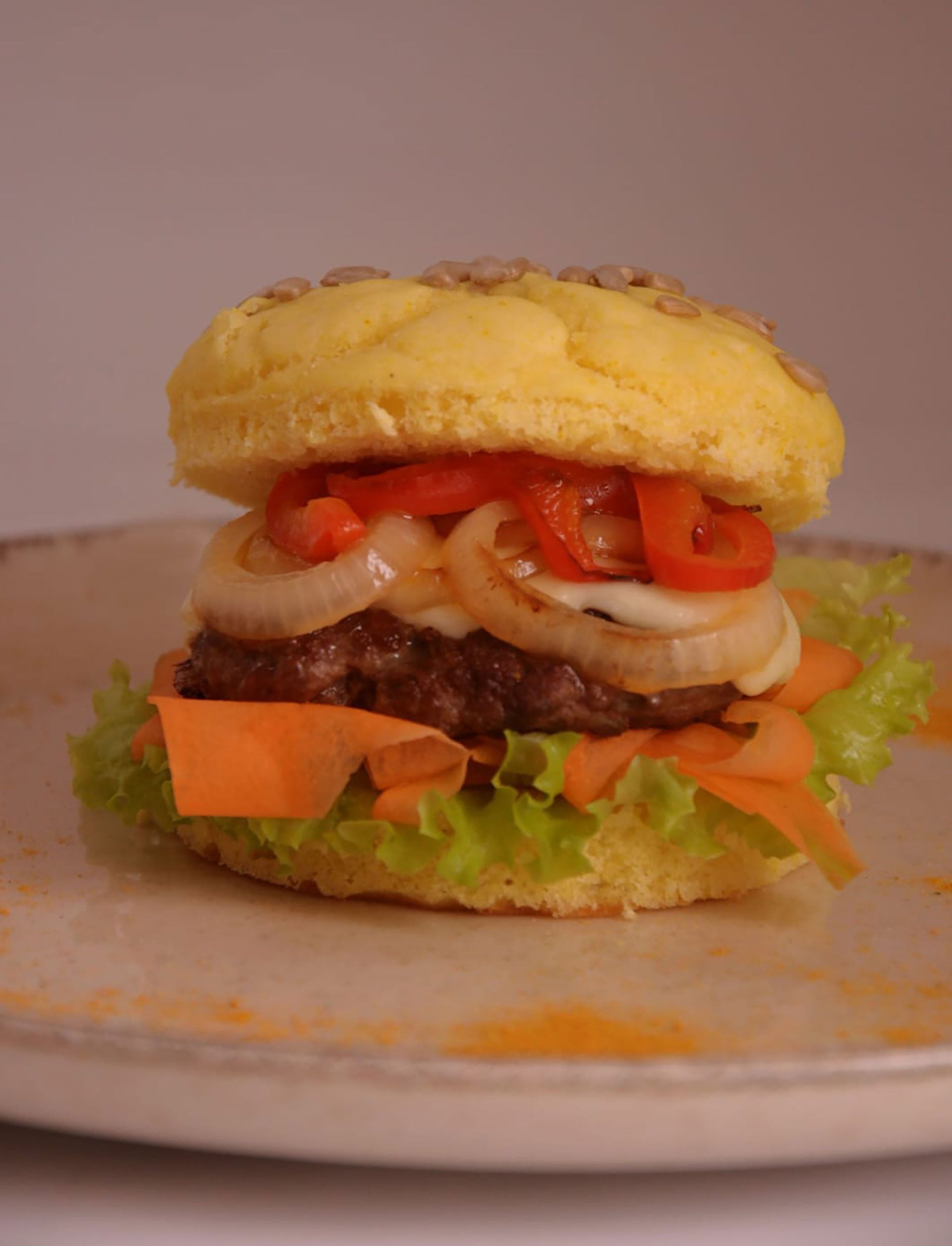 En cuanto al pan, dejar levar la masa por media hora. Llevar a horno precalentado a fuego mínimo de 15 a 20 minutos aproximadamente. Opcionalmente se puede tostar el pan con un poquito de manteca en una sartén. En la base del pan colocar lechuga, láminas de zanahoria, el medallón de carne con el queso y unos aros de cebolla y morrón rehogados. Por último, tapar con el pan restante.
