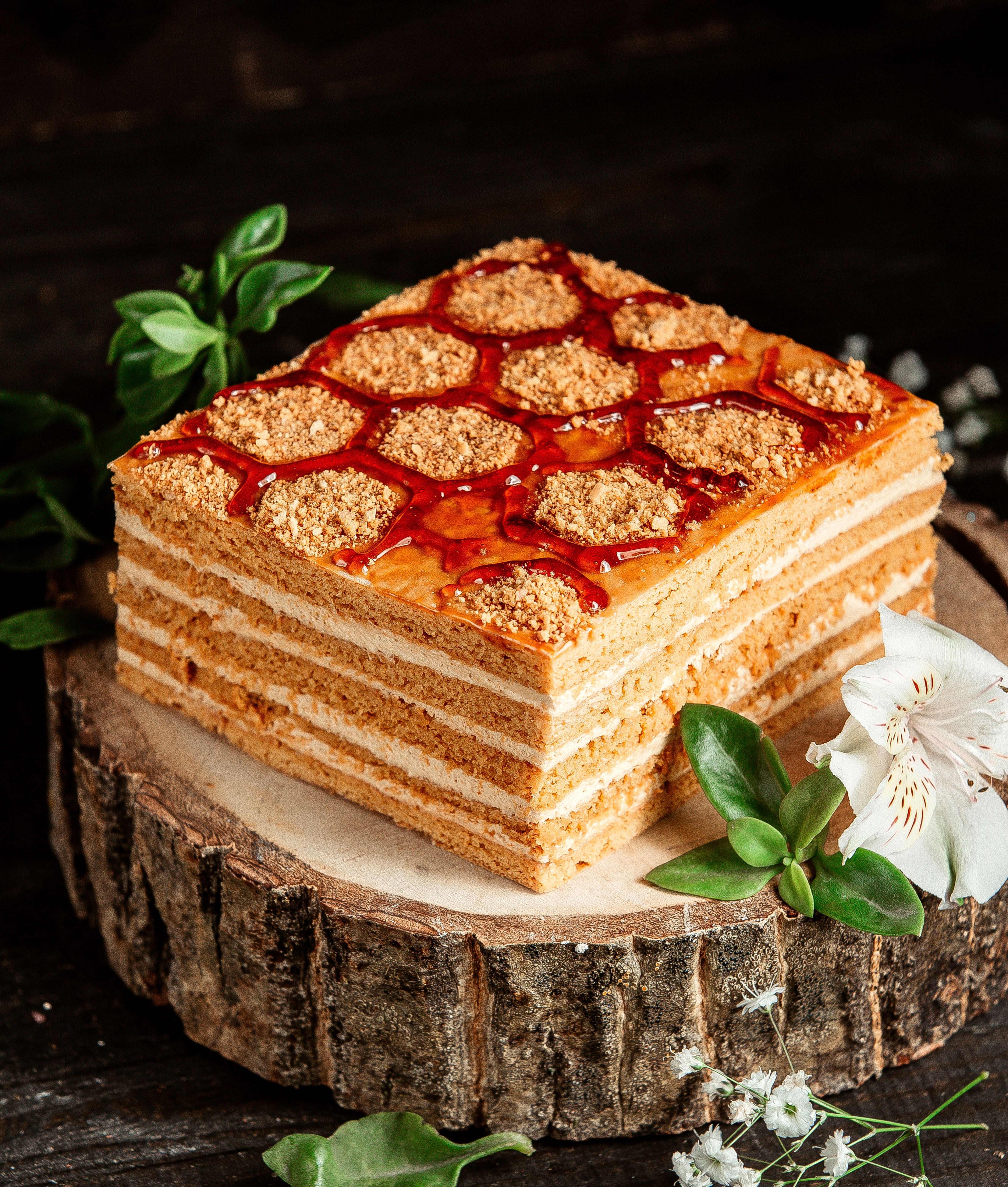 La torta, pastel o tarta Medovik es un postre de miel ruso típico de ese país. Su historia que se remonta a hace 200 años cuando el chef personal de zar ruso Alejandro I la elaboró por primera vez. La medovik es elaborada con varias capas de galletas de miel grandes y después se rellena de una mezcla de crème fraîche y crema montada. Todo esto decorado con una sencilla pero vistosa capa de migas de galletas. Su preparación es sencilla los ingredientes muy comunes.