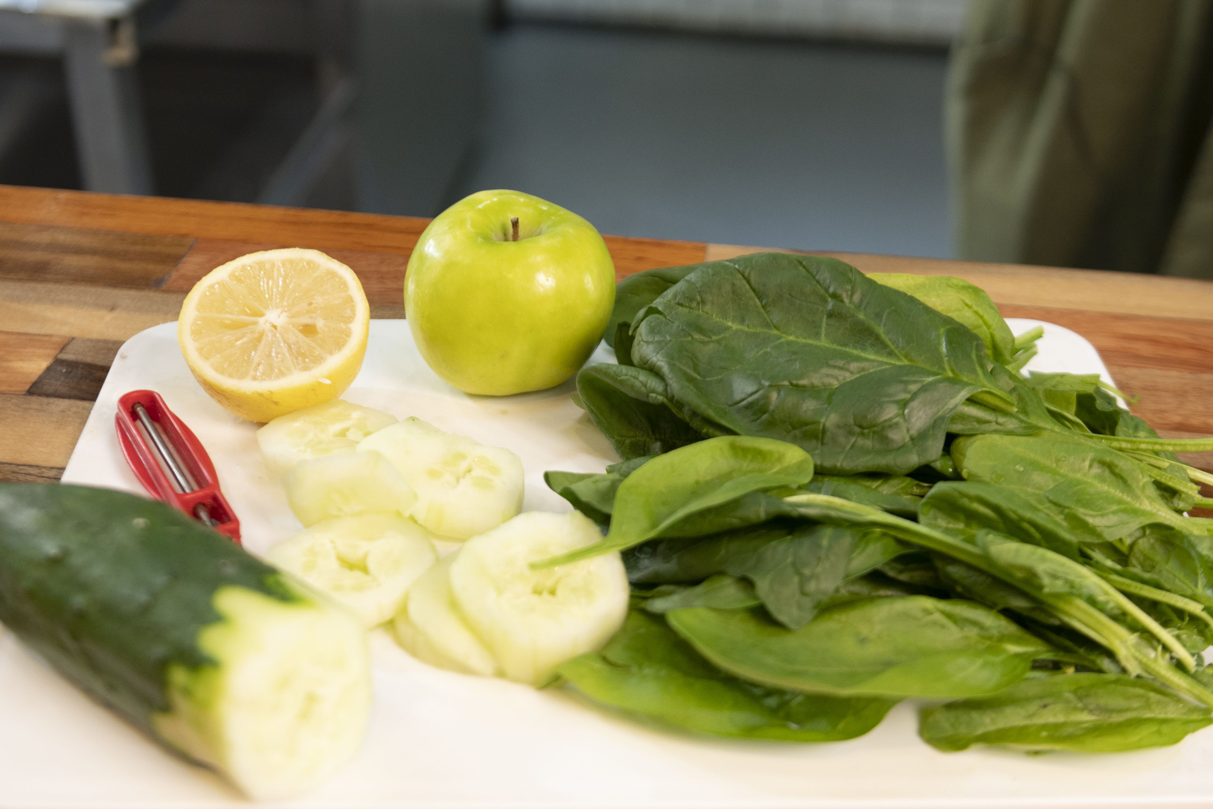 100 gramos de espinaca fresca, una manzana verde, medio pepino, jugo de limón y edulcorante a gusto.