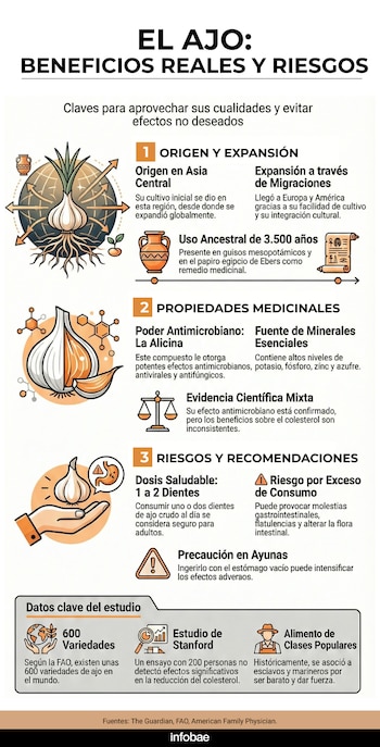El consumo de uno o dos dientes de ajo crudo al día es considerado saludable para adultos. Sin embargo, excederse puede provocar molestias gastrointestinales, flatulencias y alteraciones en la flora intestinal, particularmente si se ingiere en ayunas. Estos efectos adversos son documentados en la revista clínica American Family Physician, que recomienda la moderación y tomar en cuenta la tolerancia individual.