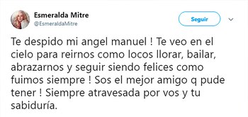 Y no faltaron las palabras de despedida de la actriz:"Te despido mi angel manuel ! Te veo en el cielo para reirnos como locos llorar, bailar, abrazarnos y seguir siendo felices como fuimos siempre ! Sos el mejor amigo q pude tener ! Siempre atravesada por vos y tu sabiduría", escribió en su cuenta de Twitter.