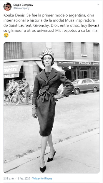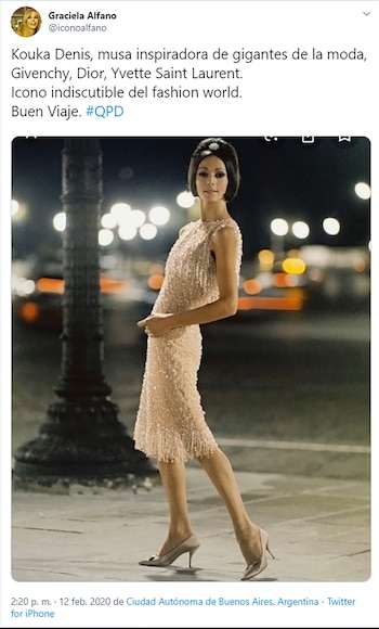 Graciela Alfano en su cuenta de Twitter dijo: “Kouka Denis, musa inspiradora de gigantes de la moda, Givenchy, Dior, Yves Saint Laurent. Icono indiscutible del fashion world. Buen Viaje. #QPD”