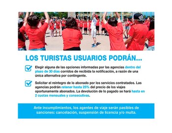 -Las agencias deberán ofrecer la reprogramación de los viajes estudiantiles que podrán realizarse en un plazo de 12 meses posteriores a la fecha del levantamiento de las medidas restrictivas de circulación.