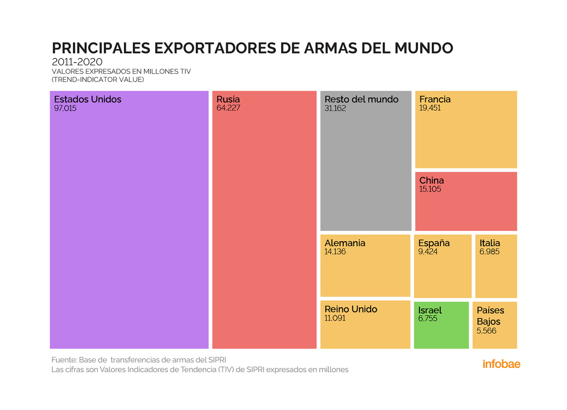 InfobaeData Unit завантажив та проаналізував обсяги закупівель та продажу зброї між країнами світу за останні 10 років, з глобальної бази з військовими закупівлями, розробленою Міжнародним інститутом досліджень миру ( SIPRI ), некомерційною організацією, що базується в Стокгольм, Швеція, який щорічно оновлює дані. Однак слід мати на увазі, що багато контрактів є таємними і невідомими, і що є також важливий чорний ринок зброї.