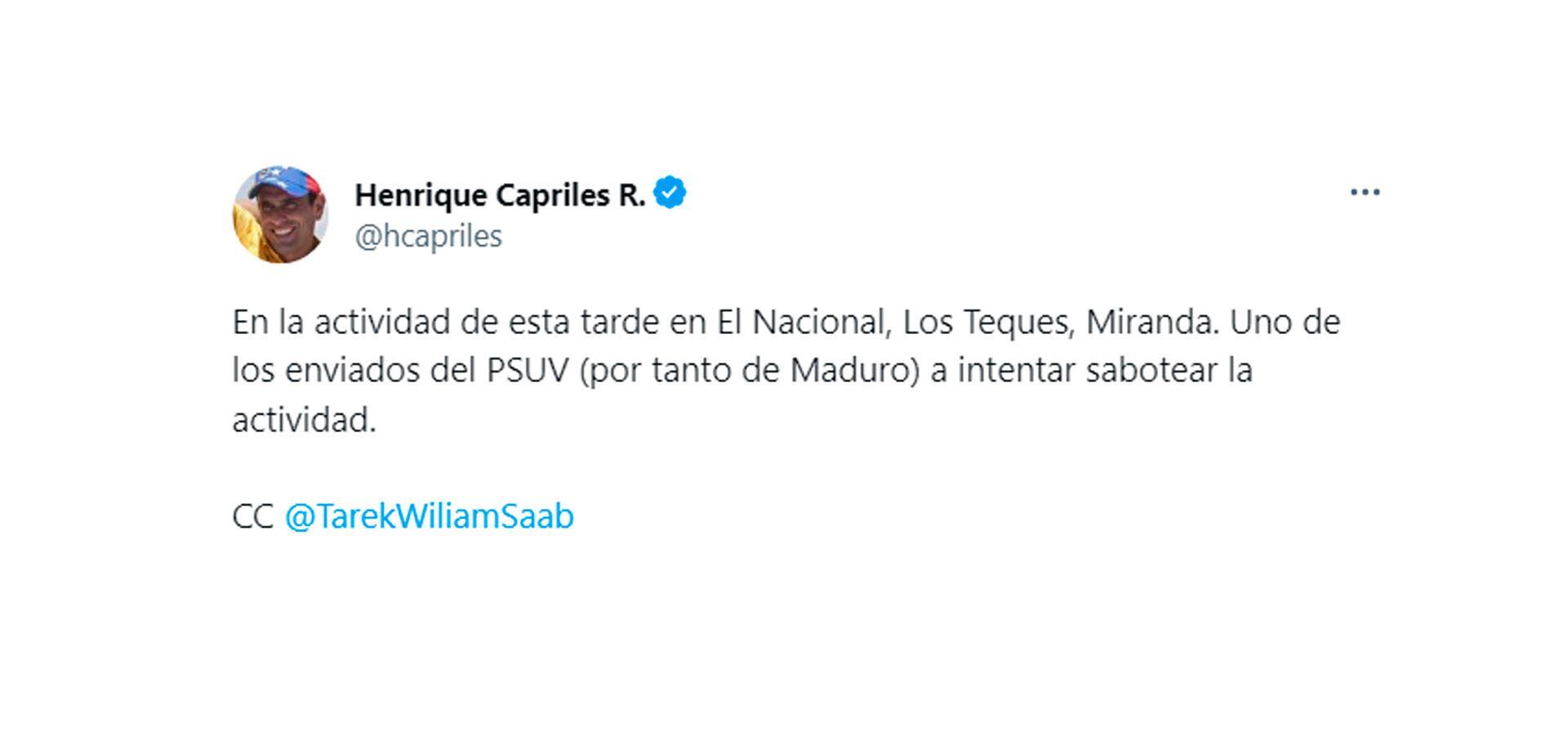 En su cuenta de Twitter, publicó dos fotografías de un hombre con un machete, a quien Capriles señaló como “uno de los enviados del PSUV” y, “por tanto, de (el dictador Nicolás) Maduro”, con el fin de “intentar sabotear la actividad”, un mensaje en el que el opositor etiquetó al fiscal general, Tarek William Saab.