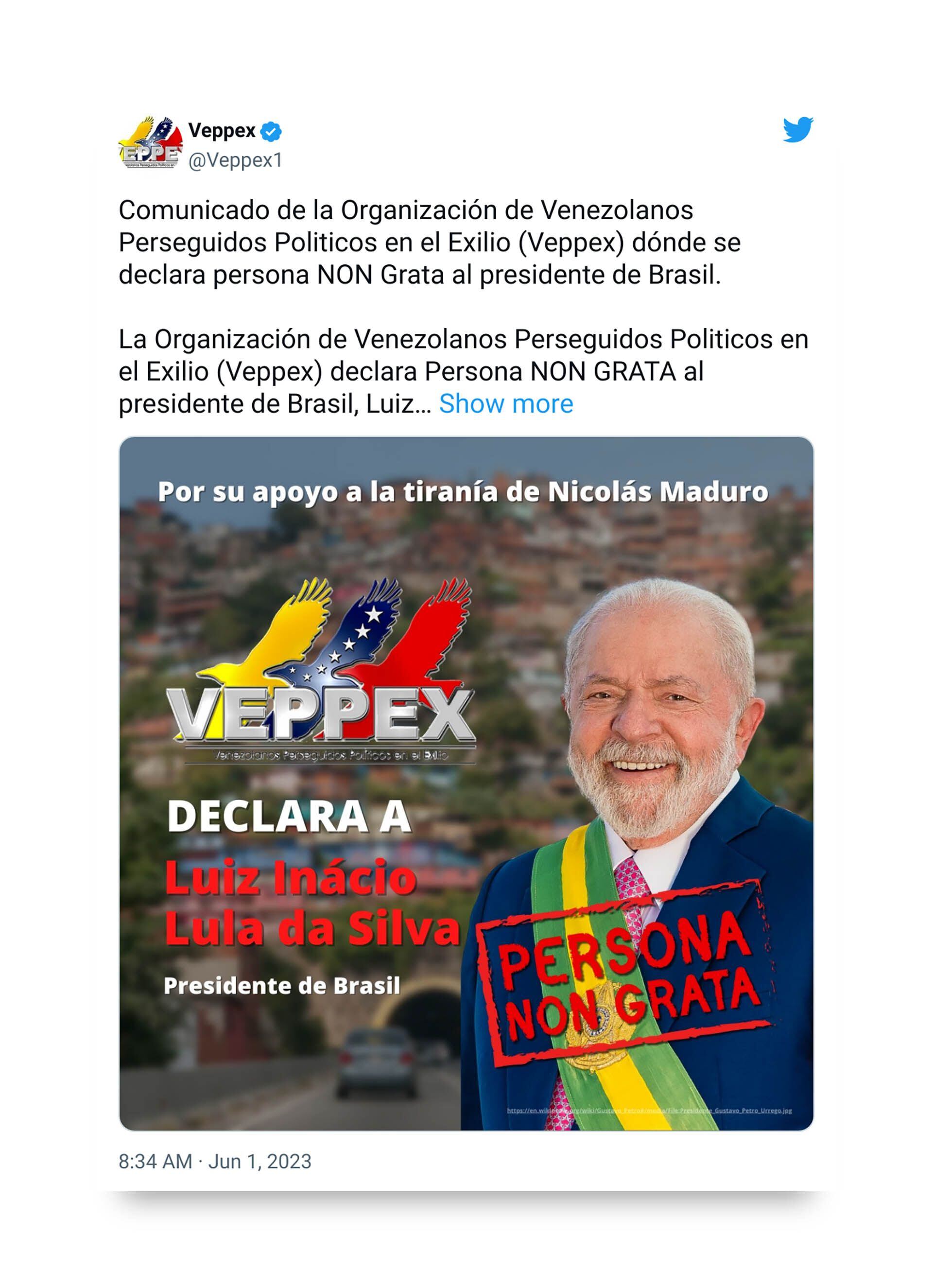 El presidente Lula pretende ignorar “muchos hechos que son públicos” y que “demuestran el régimen que impera en Venezuela, como por ejemplo los 7 millones de venezolanos en el mundo y la existencia de cientos de presos políticos”, los cuales “son una realidad que el presidente de Brasil pretende ignorar”, señaló en la nota el titular de Veppex, José Antonio Colina.