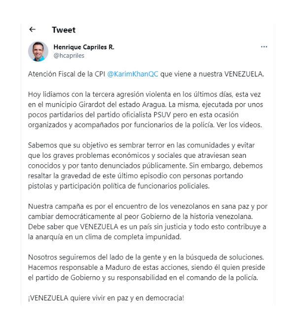 “Hoy lidiamos con la tercera agresión violenta en los últimos días, esta vez en el municipio Girardot del estado Aragua (...), ejecutada por unos pocos partidarios del partido oficialista PSUV, pero, en esta ocasión, organizados y acompañados por funcionarios de la policía”, dijo, en Twitter, el opositor, quien aseguró que algunos de los agresores portaban pistolas.