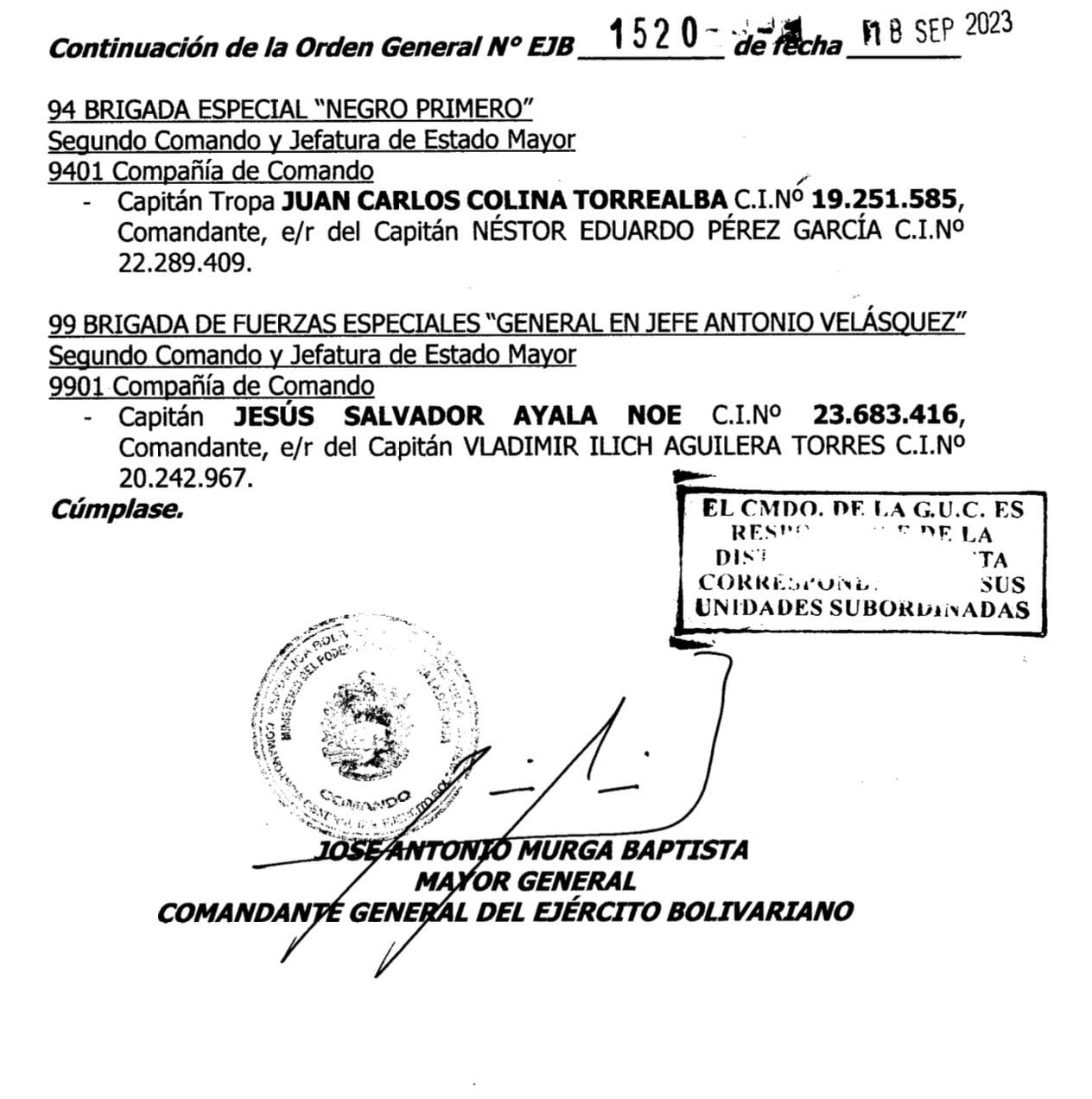 El comandante General del Ejército, MG José Antonio Murga Baptista, suscribió el 18 de septiembre de 2023 la orden 1520, con los jefes de las diversas Compañías, Escuadrones y Comandos del componente Ejército Bolivariano. Destaca la gran cantidad de ratificaciones y enroques. Estos son los nombramientos de los 162 oficiales: