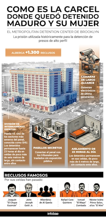 Ya en suelo norteamericano, el ex dictador venezolano fue trasladado al Metropolitan Detention Center (MDC) de Brooklyn. Se trata de una de las prisiones federales más conocidas de Estados Unidos, administrada por la Oficina Federal de Prisiones (BOP) y utilizada históricamente para la detención de presos de alto perfil. Allí permanecerá alojado, al menos de manera momentánea, hasta su primera audiencia judicial.