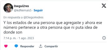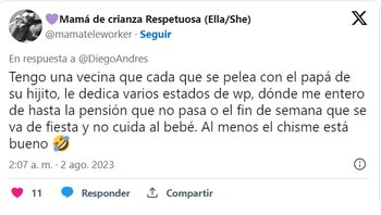 “Tengo una vecina que cada que se pelea con el papá de su hijito, le dedica varios estados de wp, dónde me entero de hasta la pensión que no pasa o el fin de semana que se va de fiesta y no cuida al bebé. Al menos el chisme está bueno”, compartió otro usuario de la red social.