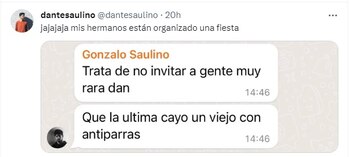 La historia se originó cuando los hermanos empezaron a organizar una fiesta conjunta. Dante, en su entusiasmo por compartir el evento en sus redes sociales, decidió publicar una captura de pantalla de la conversación en WhatsApp con sus hermanos, en la que uno de ellos había hecho una solicitud bastante particular: “Trata de no invitar a gente muy rara, Dan, que a la última vino un viejo con antiparras”, escribió su hermano, Gonzalo. La mención de “antiparras” desató la curiosidad de los internautas y el chat se volvió un fenómeno viral.
