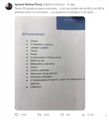 El chef tomó su cuenta de redes sociales para expresar su asombro, comentando: “Tener 20 alérgicos para una boda… si en las bodas de los 80 y los 90 le plantan esto a un cocinero… no aparece un alérgico ni de lejos”. Su publicación iba acompañada de una imagen con la lista de intolerancias alimentarias que habían proporcionado algunos de los invitados: gluten, lácteos, pescado y mariscos, cerdo, carne, pimiento, manzana, entre otros.