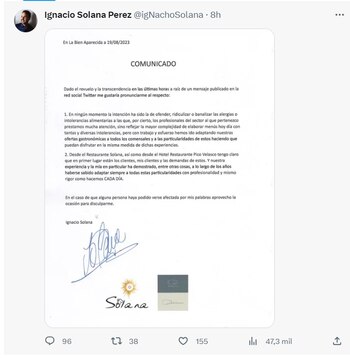 Fue tal la repercusión de su tuit que, hace unas horas, el reconocido chef decidió publicar un comunicado en su cuenta explicando la situación: “En ningún momento la intención ha sido la de ofender, ridiculizar o banalizar las alergias o intolerancias alimentarias a las que, por cierto, los profesionales del sector al que pertenezco prestamos mucha atención”, comenzó diciendo.