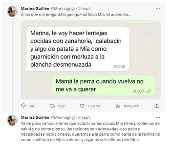 A medida que el tuit ganaba tracción, Marina sintió la necesidad de aclarar que las atenciones culinarias de Mía estaban relacionadas con sus problemas de salud y necesidades nutricionales específicas. “Mía tiene problemas de salud y no come alimento balanceado. Las raciones son adecuadas a su peso y necesidades nutricionales. Queremos a la perra como parte de la familia, no como sustituto de hijos o nietos”, escribió, defendiendo el amor incondicional que sienten por su mascota.