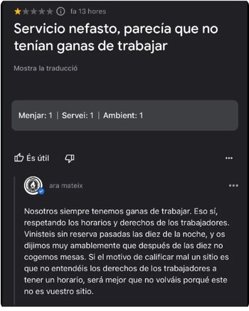 Según explicaron desde el establecimiento, los clientes se presentaron sin reserva después de las diez de la noche, momento en que el restaurante ya no acepta mesas. La respuesta del restaurante ante la queja fue contundente: “Si el motivo para calificar negativamente a un lugar es que no se comprenden los derechos de los trabajadores en cuanto a los horarios, es mejor que no regresen, ya que este no es el lugar adecuado para ustedes”.