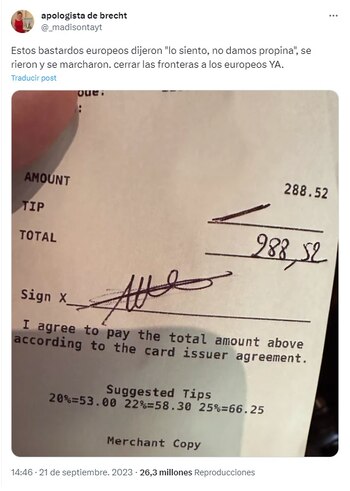 “20% es locura”, “¿Por qué debería obligarse al cliente a pagar más dinero del que debe por las compras que realizó? No tiene sentido”, “Están acostumbrados a que la propina se incluya en el precio de los productos (comida, bebidas, etc.)”, “Pago propinas en Alemania siempre, pero es una demostración de agradecimiento porque aquí les pagamos a nuestros empleados, ellos no viven de propinas, como en Estados Unidos”, “¿53€, 58€ y 66€ como sugerencias de propinas? ¿Estás mal de la olla o qué? Dile al agarrado de tu jefe que te pague un sueldo justo y basta de propinas”, “Escúchame no te voy a pagar 53 euros por tu cara bonita, hagan un sindicato como los países normales y que les pague su jefe”, fueron algunos de los comentarios de la publicación.