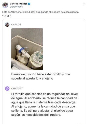 El profesor Fenollosa, conocido por su capacidad para simplificar conceptos complicados, expresó su asombro y entusiasmo en Twitter al afirmar: “Esto es 100% increíble. Estoy arreglando el inodoro de casa usando ChatGPT”. La publicación se viralizó rápidamente en la plataforma, atrayendo la atención de miles de usuarios ávidos por saber cómo logró hacerlo.