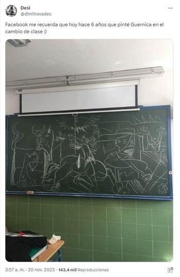 Hace seis años, durante un recreo, esta creativa internauta española decidió plasmar nada menos que El Guernica en el pizarrón del colegio. Compartió la hazaña con la leyenda: “Facebook me recuerda que hoy hace 6 años que pinté Guernica en el cambio de clase”, acompañando la publicación con una fotografía que capturó la atención de miles.