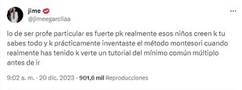 “Entonces, básicamente, te dedicas a estafar niños, ¿no? Y lo tuiteas alegremente”, “Yo en verano volví a aprender a dividir con dos cifras gracias al niño que tengo que enseñar jajaja”, “Yo si no sé algo les digo: ‘Bueno, ahora un ejercicio. Repasá y me lo explicas. Ahora eres la profe’”, “Eso pasa por creer que un profesor particular puede dar matemáticas, lengua, inglés... Yo trabajo dando clases particulares pero en una academia y doy mis materias exclusivamente”, son algunos de los comentarios de los usuarios.