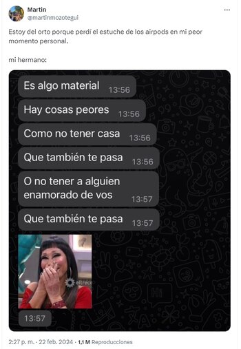 En las redes sociales se viralizan frecuentemente historias que, por su naturaleza insólita o por las reacciones que generan, capturan la atención del público. Una de estas historias recientes implica a un usuario de X (Twitter), identificado como @martinmozotegui, quien compartió en la plataforma una conversación con su hermano que no solo evidencia un momento de pérdida personal sino también una reflexión sobre lo que verdaderamente importa en la vida.