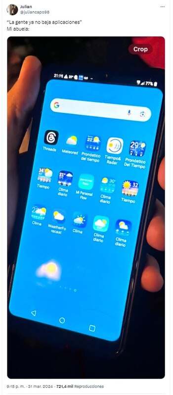En una acción que siguió a la viralización de la primera publicación, @juliancapo98 añadió un comentario sugiriendo que, para simplificar el uso del móvil de su abuela, eliminó todas las aplicaciones del clima, excepto “su favorita”. Este gesto, a su vez, incitó aún más la conversación con usuarios debatiendo sobre la utilidad de tener múltiples aplicaciones con funciones similares y cómo las preferencias personales influyen en la configuración de los dispositivos electrónicos.