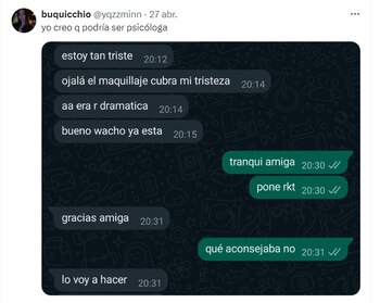 La publicación de @yqzzmin captura una conversación en la que recomienda a su amiga escuchar RKT, un popular género urbano argentino, como una forma de superar la tristeza. La respuesta de su amiga, “Gracias, lo voy a hacer”, refleja la receptividad hacia el consejo, mientras que Yazmín divertida escribió: “Yo creo que podría ser psicóloga”, resaltando el efecto terapéutico de su peculiar recomendación.